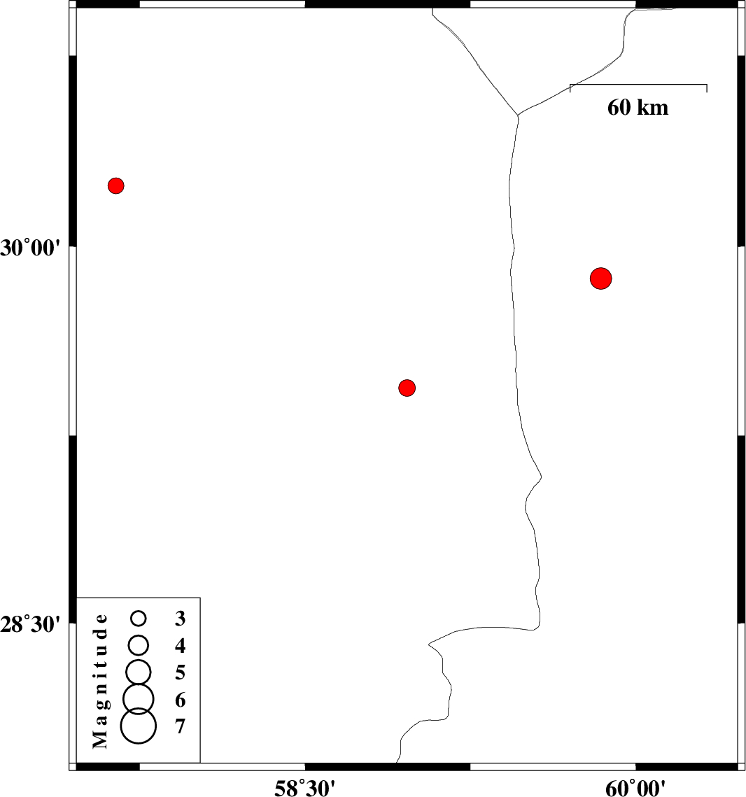 | 2024/06/28 | 22:54:04.0 | 02:24:04.0 | 29.438 | 58.962 | 14 | ML:3.4 | Kerman Province, 69 km North-East of Bam | ||