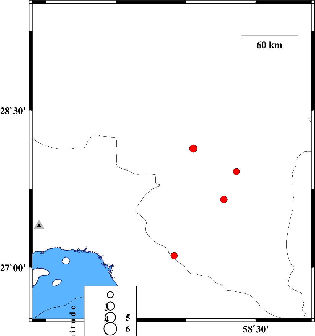 | 2024/06/28 | 22:54:04.0 | 02:24:04.0 | 29.438 | 58.962 | 14 | ML:3.4 | Kerman Province, 69 km North-East of Bam | ||