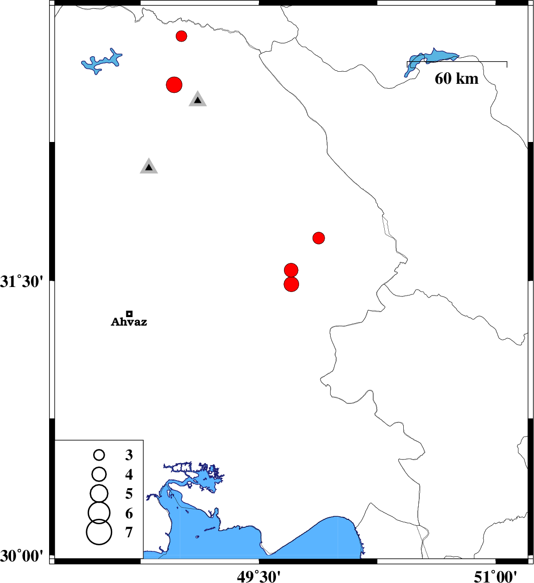 | 2024/07/16 | 18:55:38.2 | 22:25:38.2 | 32.817 | 49.008 | 8 | ML:3.1 | Khoozestan Province, 49 km North-West of Lali | ||