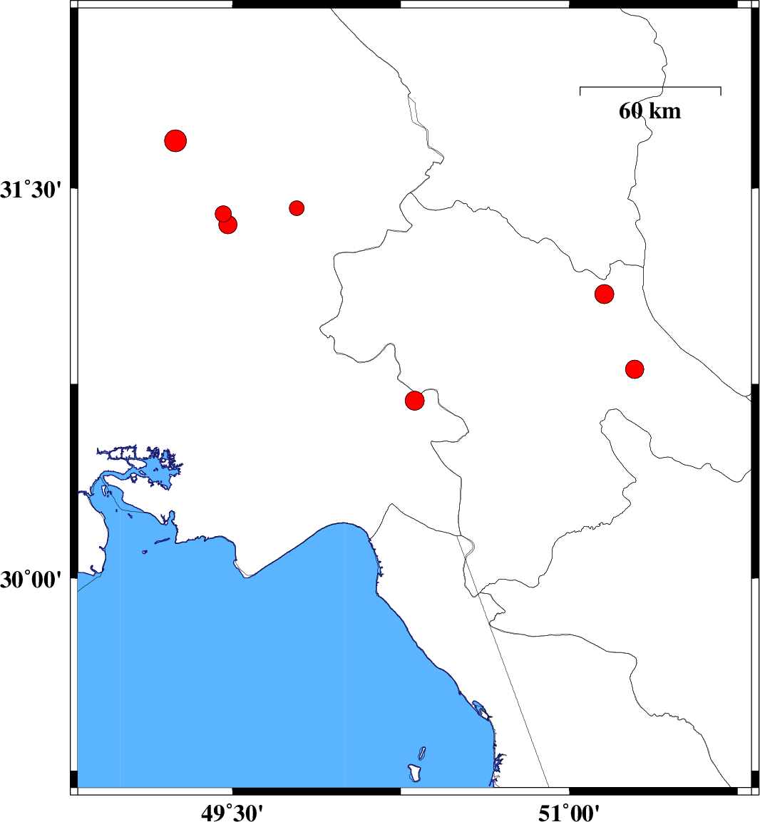 | 2024/08/26 | 01:37:12.1 | 05:07:12.1 | 31.402 | 49.459 | 12 | ML:3.3 | Khoozestan Province, 20 km North-West of Ramhormoz | ||