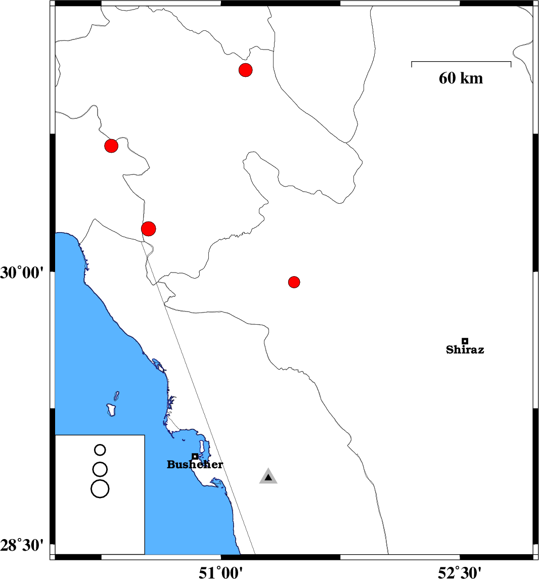 2024/08/30 | 14:51:13.4 | 18:21:13.4 | 29.014 | 50.175 | 12 | ML:3.7 | Persian Gulf, 64 km -West of Busheher | ||