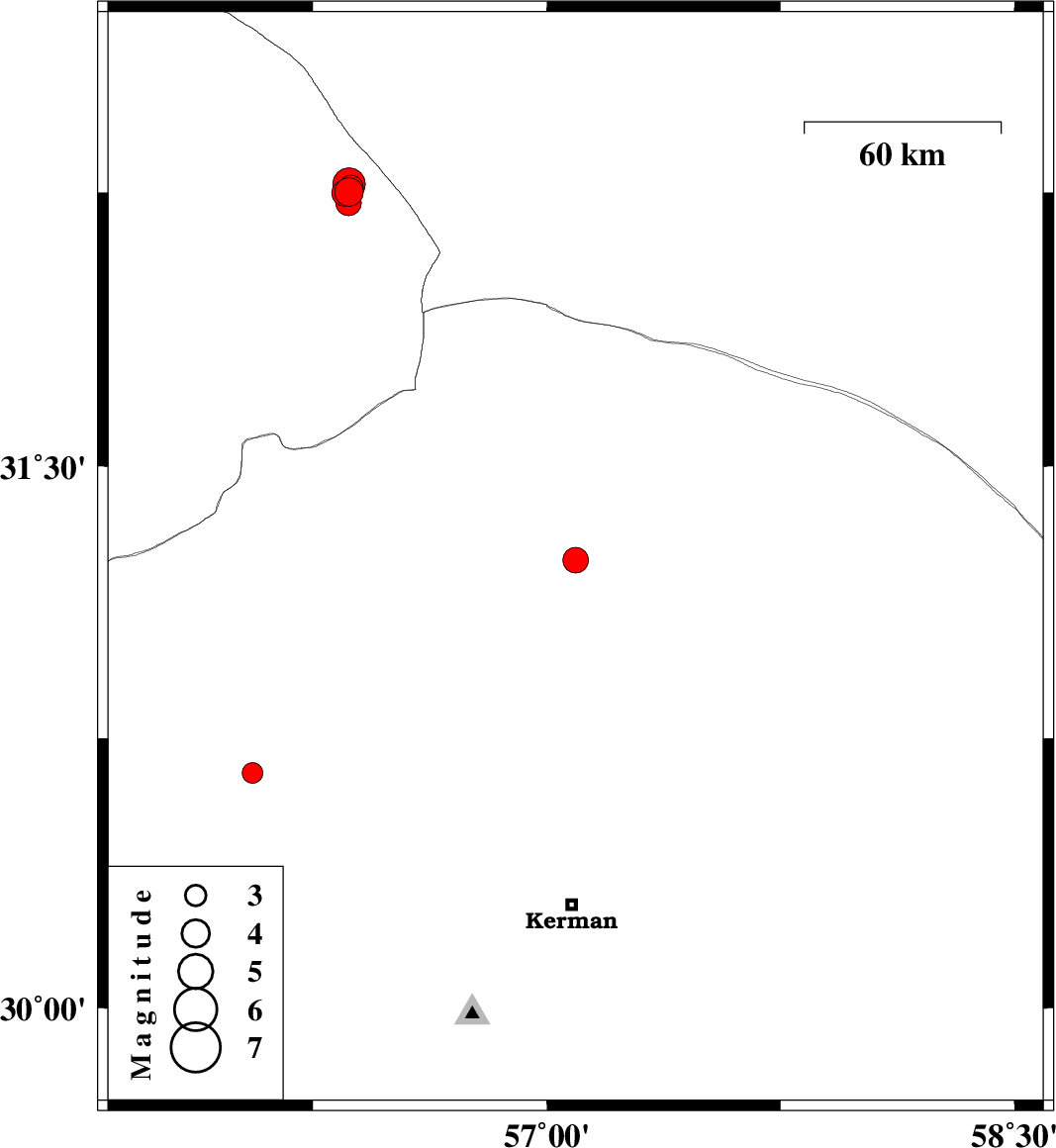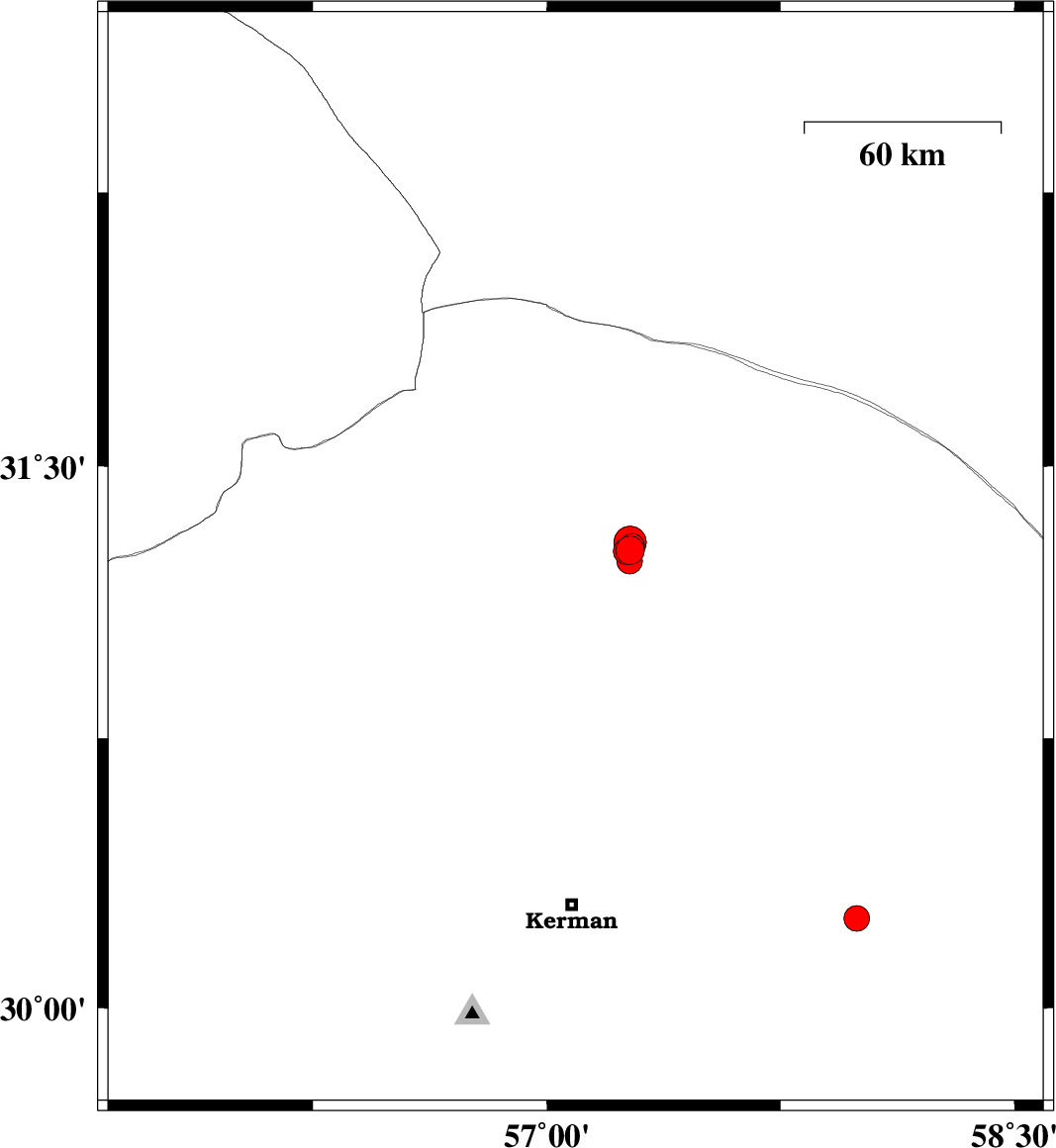 | 2024/10/04 | 18:26:21.3 | 21:56:21.3 | 30.654 | 56.055 | 12 | ML:3 | Kerman Province, 28 km North of Rafsanjan |