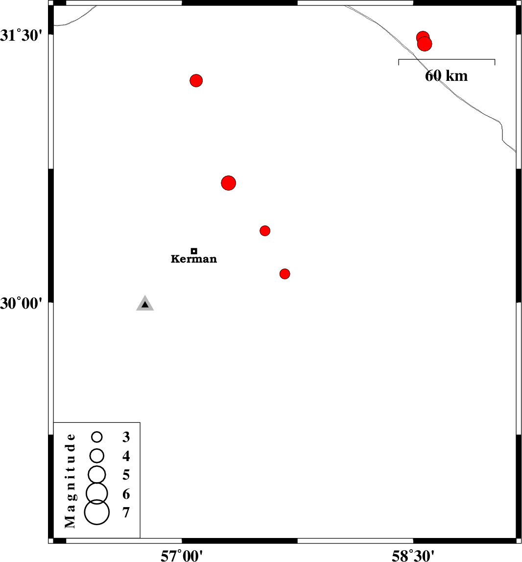 | 2024/10/02 | 20:08:15.6 | 23:38:15.6 | 30.402 | 57.538 | 12 | ML:3 | Kerman Province, 46 km North-East of Kerman | ||