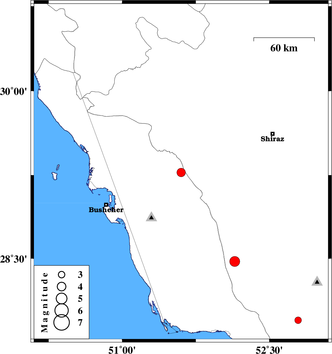 | 2024/10/09 | 04:45:41.9 | 08:15:41.9 | 27.943 | 52.793 | 12 | ML:3.1 | Fars Province, 45 km North of Mehr |