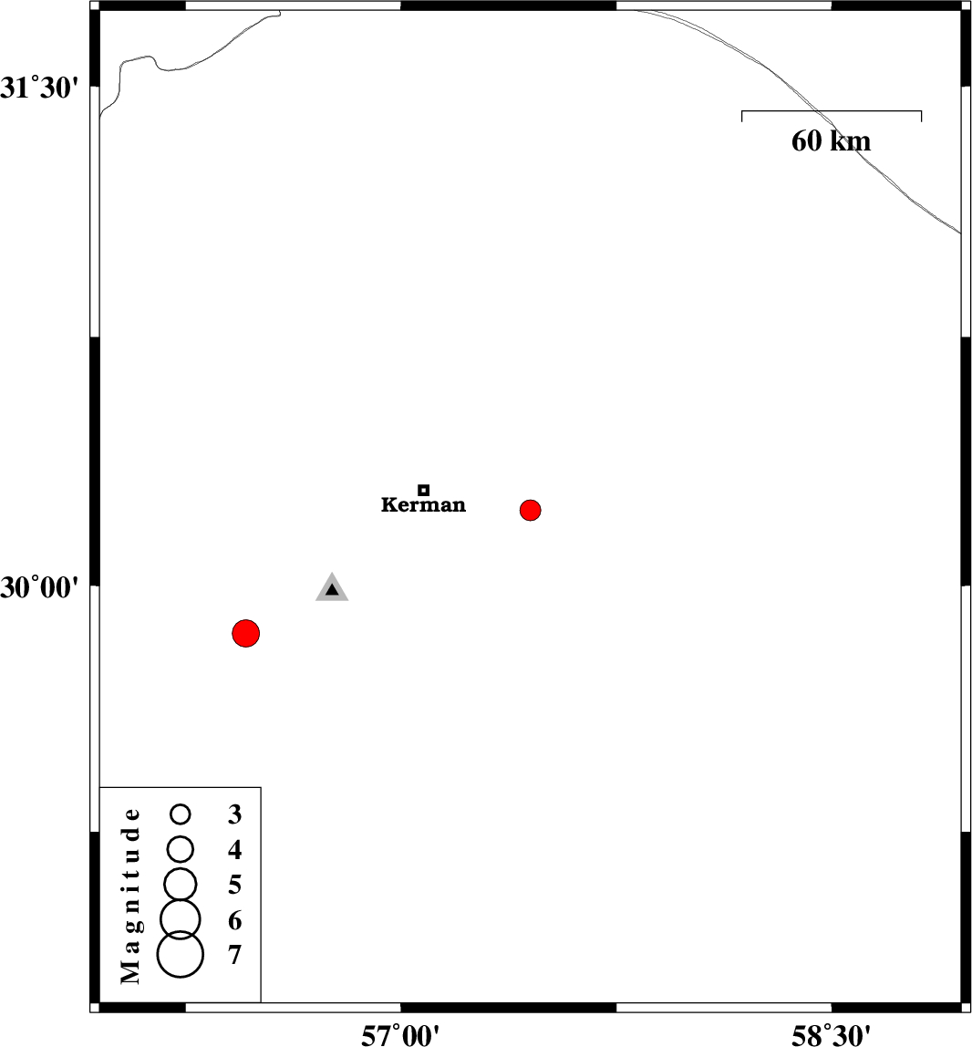 | 2024/11/05 | 03:40:31.3 | 07:10:31.3 | 30.227 | 57.45 | 10 | ML:3.3 | Kerman Province, 36 km -East of Kerman | ||