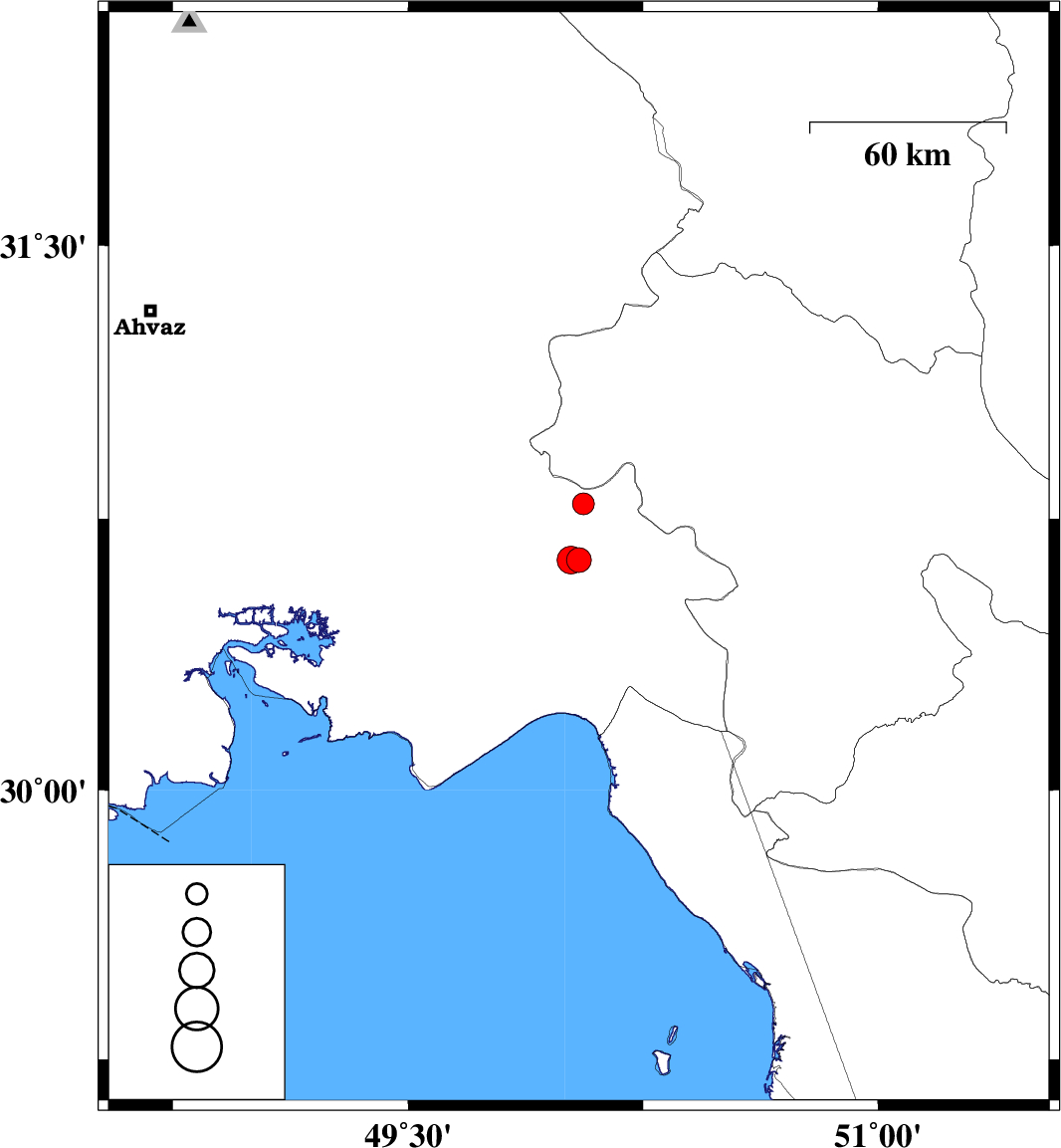 2024/11/08 | 04:01:46.4 | 07:31:46.4 | 30.791 | 50.059 | 10 | ML:3.1 | Khoozestan Province, 28 km North-West of Behbahan |