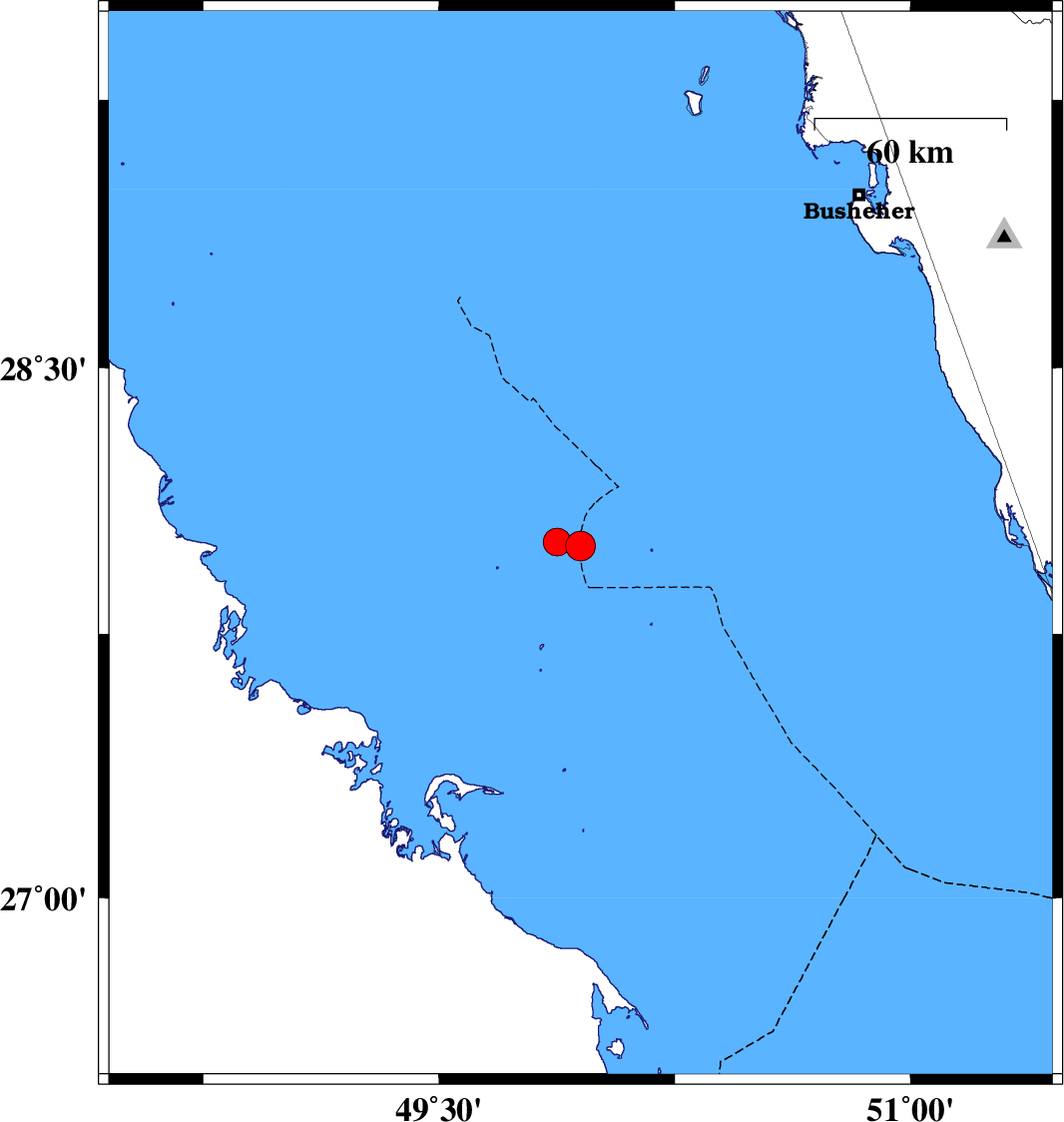 | 2024/10/29 | 23:20:44.7 | 02:50:44.7 | 28.009 | 49.875 | 12 | ML:3.9 | Persian Gulf |