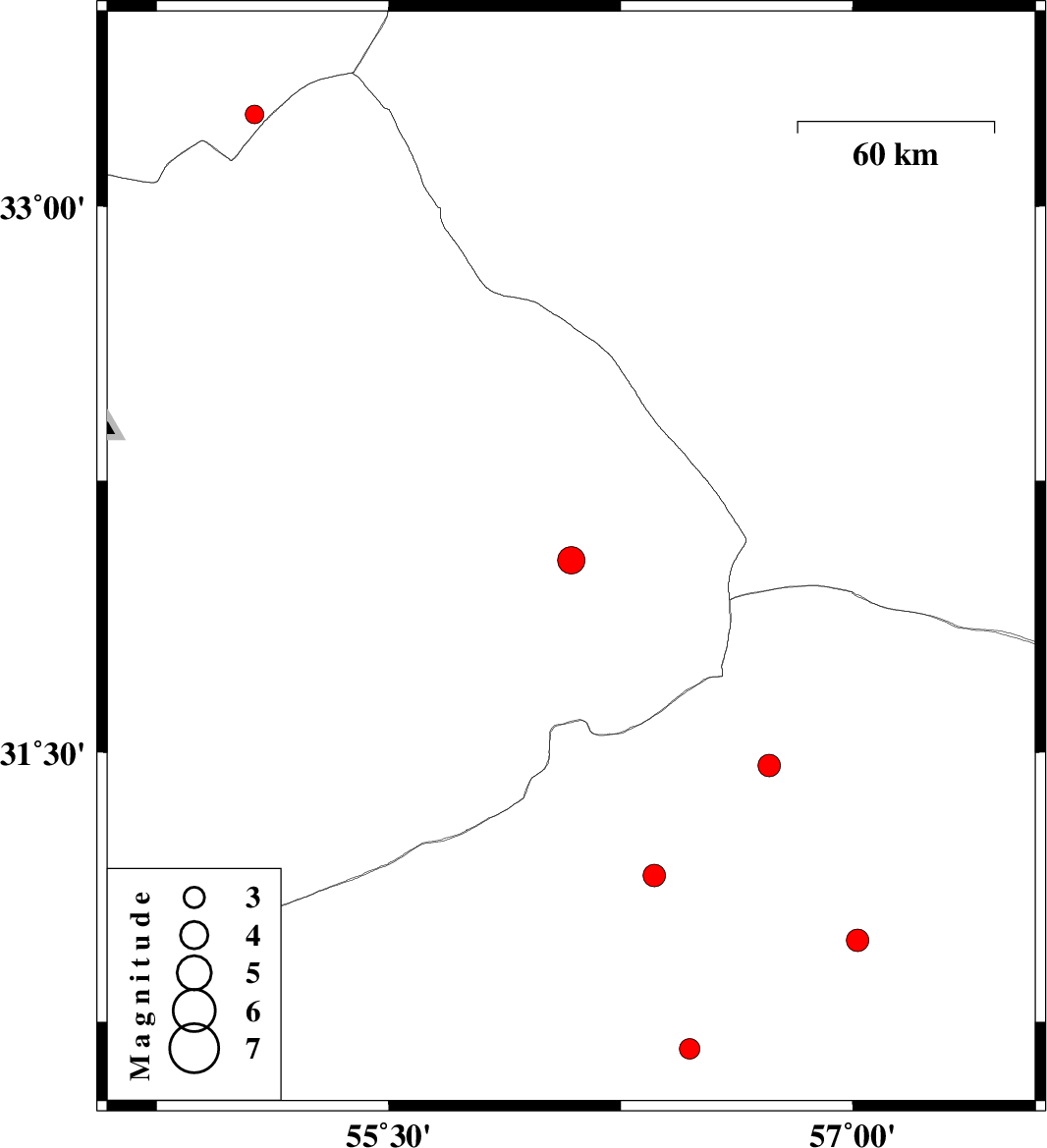 | 2024/11/14 | 04:49:16.1 | 08:19:16.1 | 32.031 | 56.09 | 12 | ML:3.9 | Yazd Province, 81 km North-East of Bafq | ||