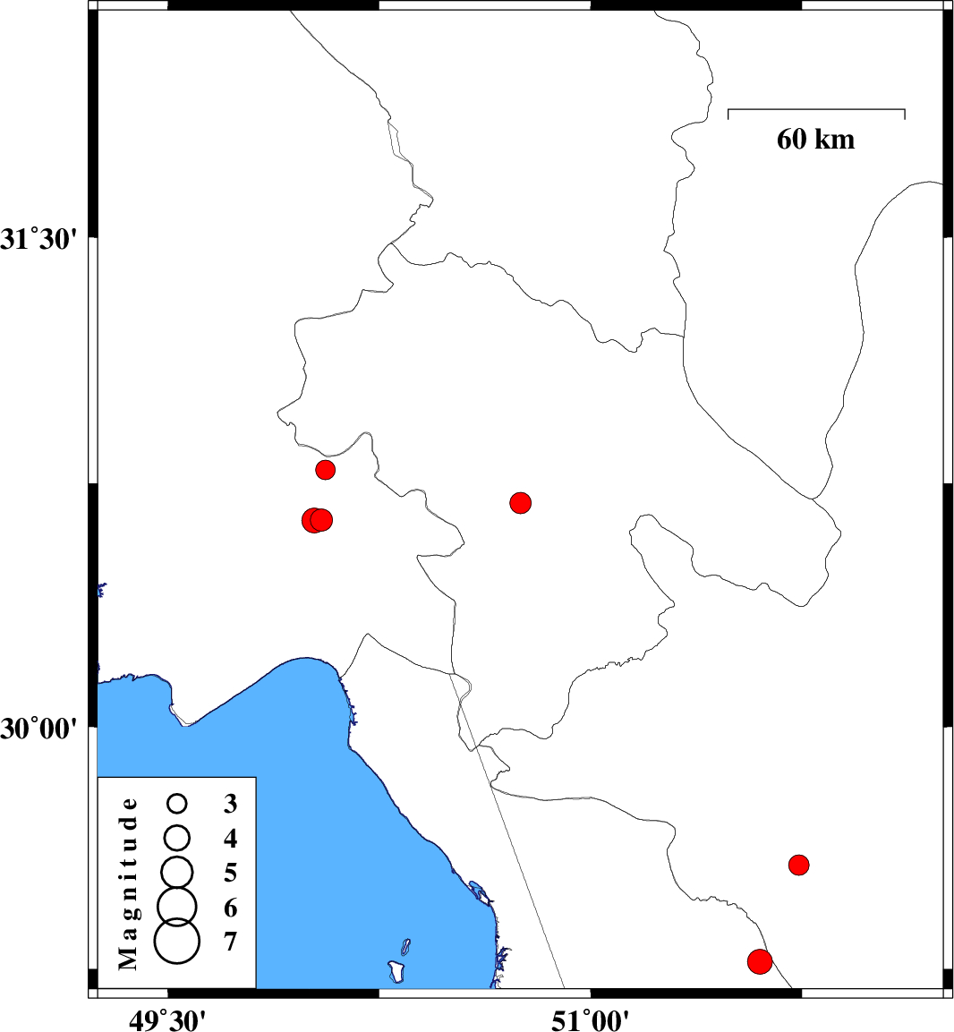 | 2024/11/08 | 04:01:46.4 | 07:31:46.4 | 30.791 | 50.059 | 10 | ML:3.1 | Khoozestan Province, 28 km North-West of Behbahan | ||