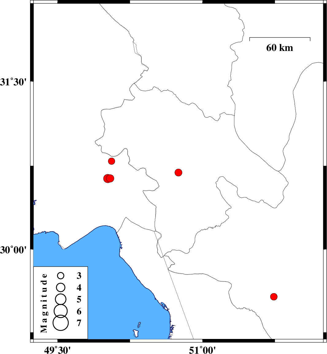 | 2024/11/08 | 04:01:46.4 | 07:31:46.4 | 30.791 | 50.059 | 10 | ML:3.1 | Khoozestan Province, 28 km North-West of Behbahan |