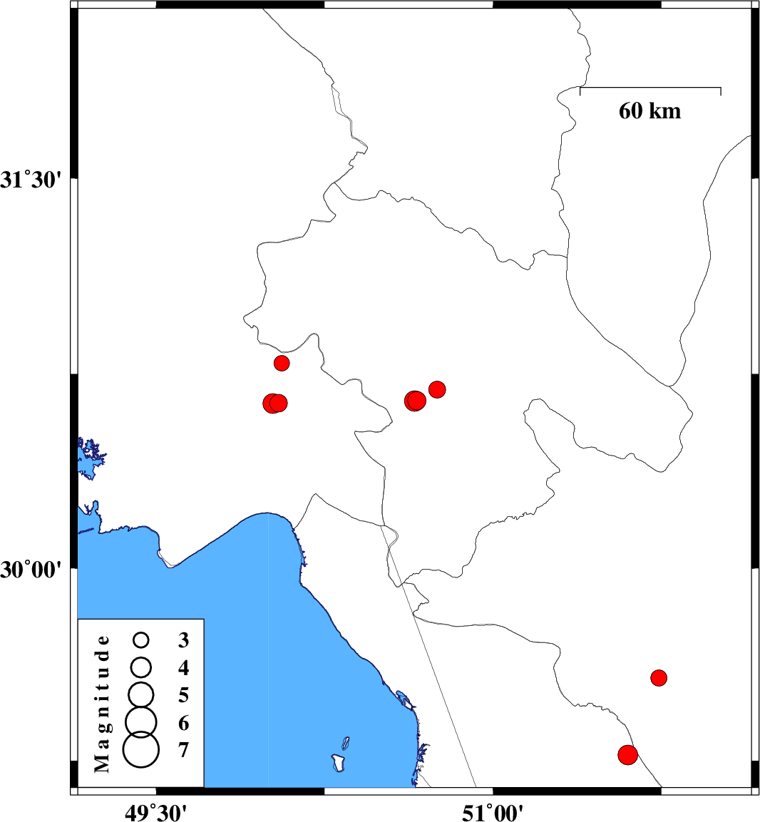 | 2024/11/08 | 04:01:46.4 | 07:31:46.4 | 30.791 | 50.059 | 10 | ML:3.1 | Khoozestan Province, 28 km North-West of Behbahan | ||
