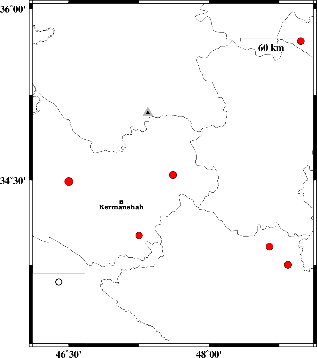 | 2024/11/27 | 05:38:56.1 | 09:08:56.1 | 34.546 | 47.615 | 5 | ML:3.5 | Kermanshah Province, 10 km of Sahneh | ||