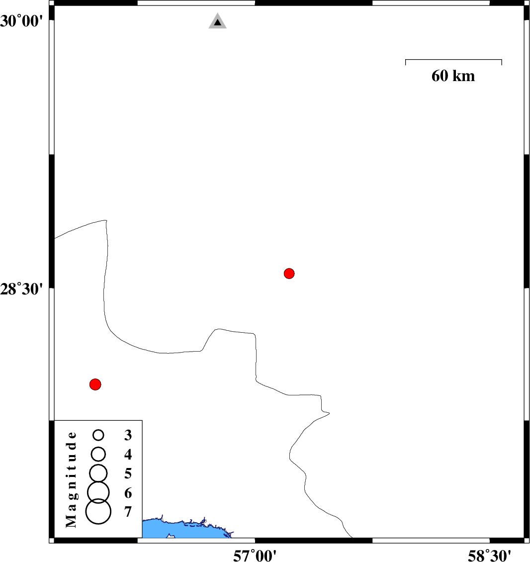 | 2024/12/05 | 03:23:21.1 | 06:53:21.1 | 28.581 | 57.218 | 12 | ML:3 | Kerman Province, 52 km -West of Jiroft | ||