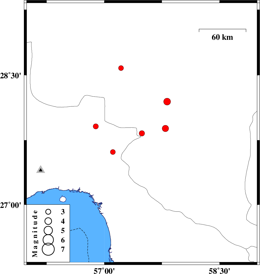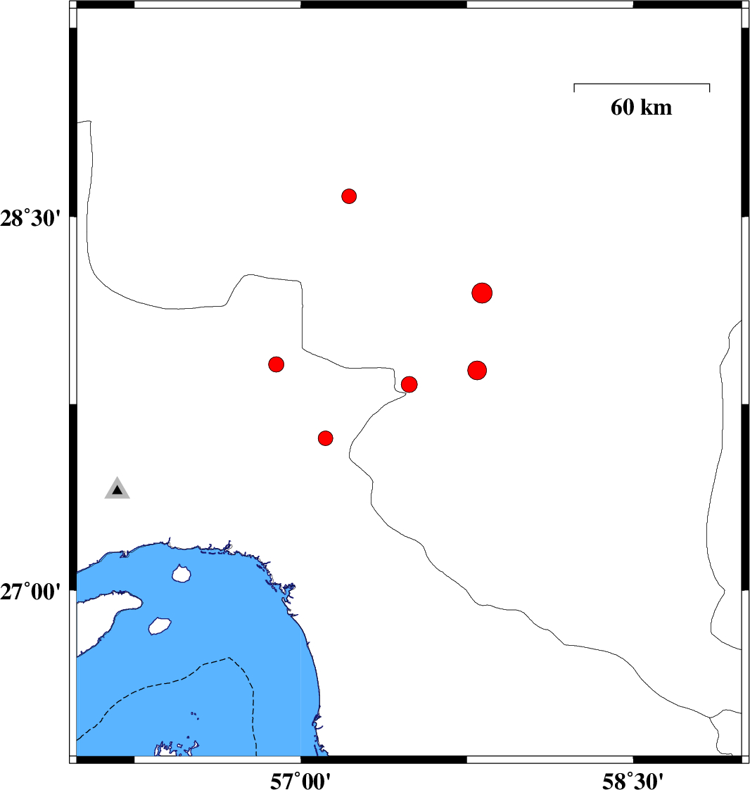 | 2024/11/19 | 12:53:06.4 | 16:23:06.4 | 28.195 | 57.818 | 10 | ML:4.1 | Kerman Province, 30 km North-East of Kahnuj | ||