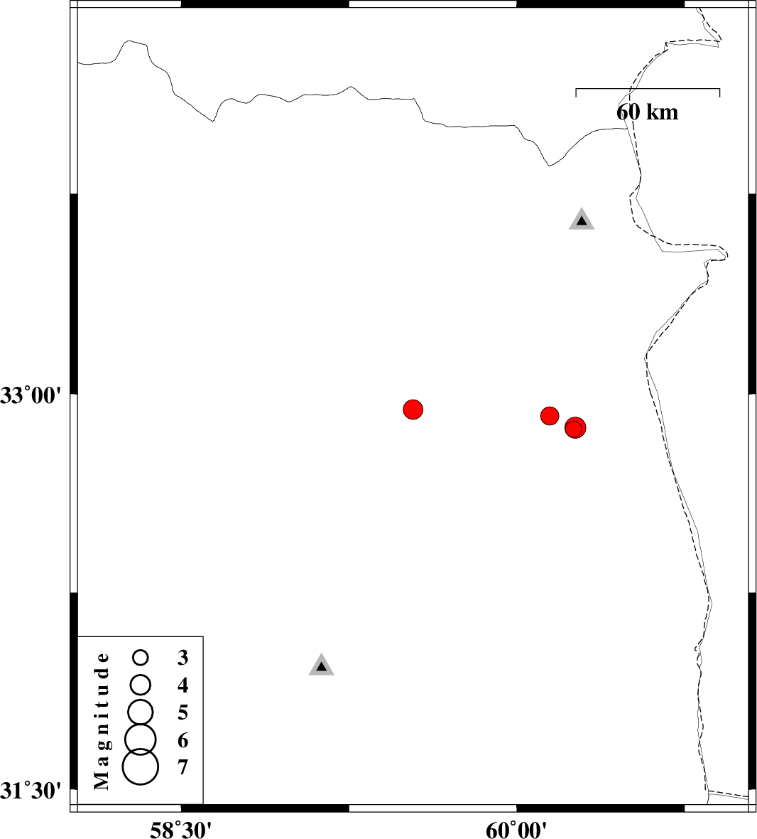 | 2025/01/07 | 03:10:06.5 | 06:40:06.5 | 32.942 | 59.536 | 10 | ML:3.9 | Khorasan(south) Province, 29 km -East of Birjand | ||