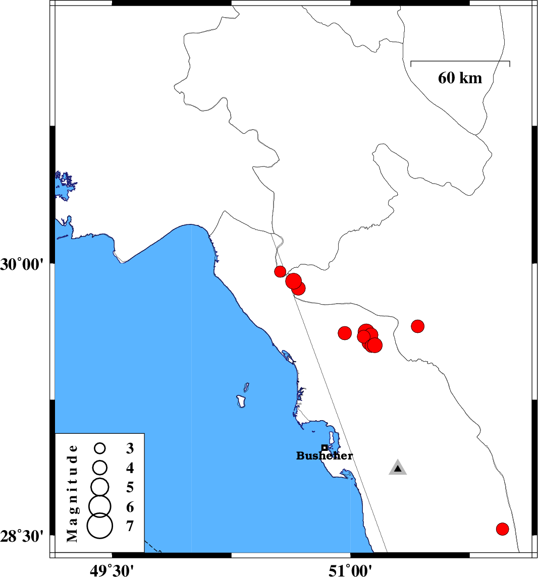2025/01/18 | 22:11:16.8 | 01:41:16.8 | 29.863 | 50.671 | 12 | ML:4 | Bushehr Province, 35 km North-East of Bandar-e genaveh | ||