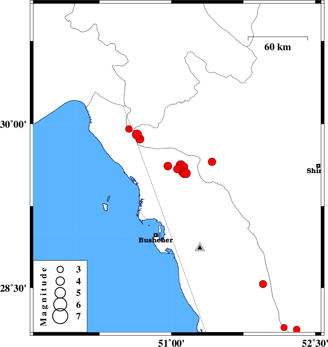 2025/01/16 | 19:20:52.1 | 22:50:52.1 | 29.568 | 51.123 | 12 | ML:4.8 | Bushehr Province, 35 km North of Borazjan | ||