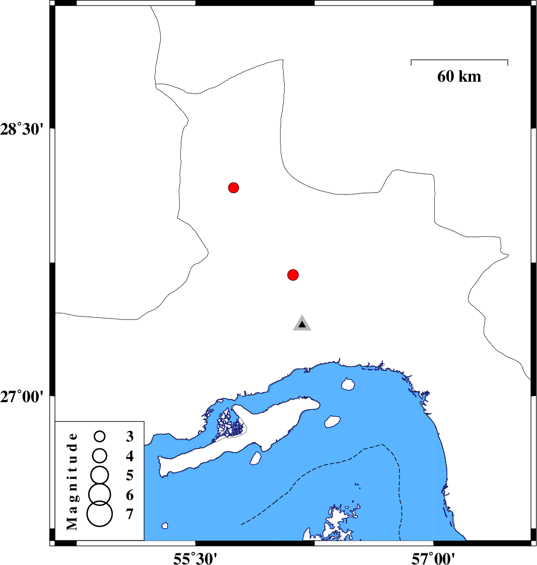| 2025/01/22 | 21:17:31.1 | 00:47:31.1 | 28.168 | 55.739 | 12 | ML:3 | Hormozgan Province, 22 km South-West of Hajiabad |