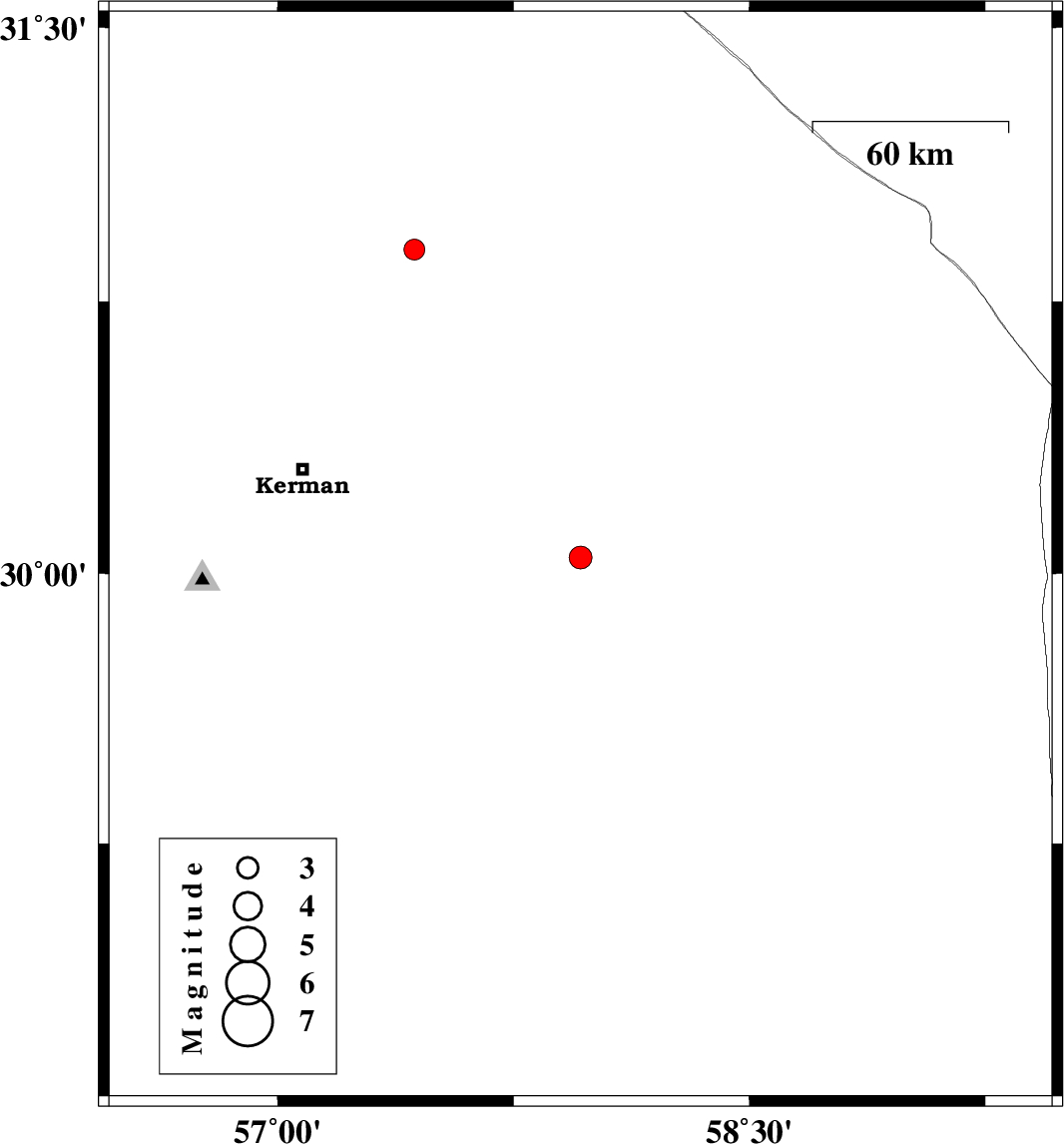 | 2025/01/25 | 15:15:59.0 | 18:45:59.0 | 30.044 | 57.963 | 12 | ML:3.2 | Kerman Province, 89 km South-East of Kerman | ||