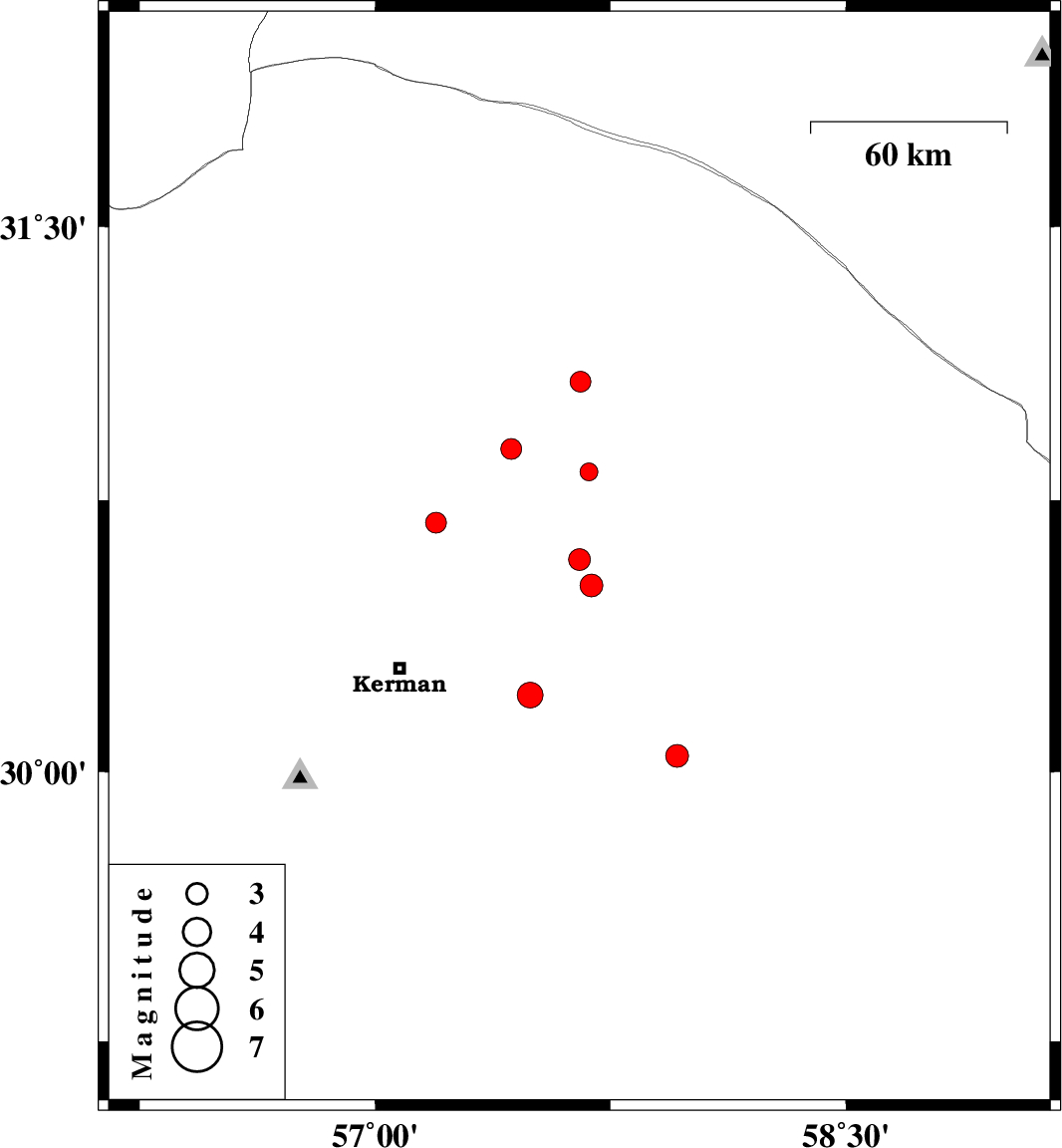 | 2025/02/15 | 22:44:37.7 | 02:14:37.7 | 30.516 | 57.689 | 16 | ML:3.2 | Kerman Province, 64 km North-East of Kerman | ||