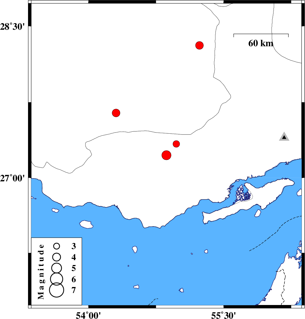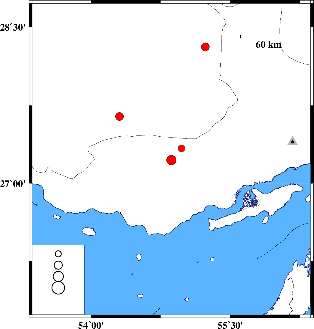 | 2025/03/08 | 18:42:33.2 | 22:12:33.2 | 27.225 | 54.865 | 12 | ML:4.6 | Hormozgan Province, 50 km -East of Bastak | ||