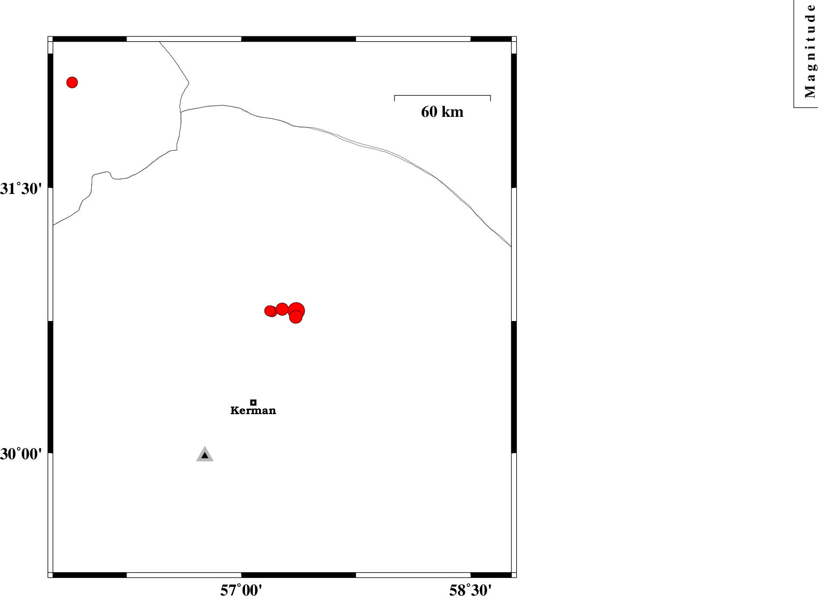 | 2025/03/24 | 11:41:49.6 | 15:11:49.6 | 30.773 | 57.356 | 12 | ML:3.8 | Kerman Province, 60 km North-East of Kerman | ||
