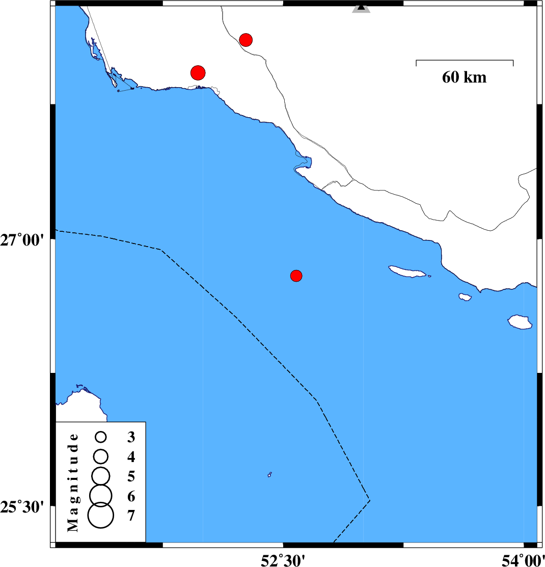 | 2025/03/20 | 23:20:42.7 | 02:50:42.7 | 26.794 | 52.581 | 12 | ML:3.3 | Persian Gulf, 89 km South-West of Mehr | ||