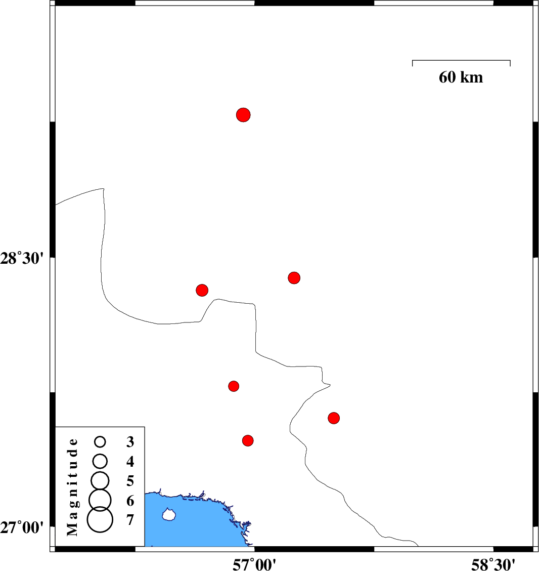 | 2025/03/22 | 01:20:08.5 | 04:50:08.5 | 27.606 | 57.496 | 12 | ML:3.3 | Kerman Province, 22 km North of Manujan |