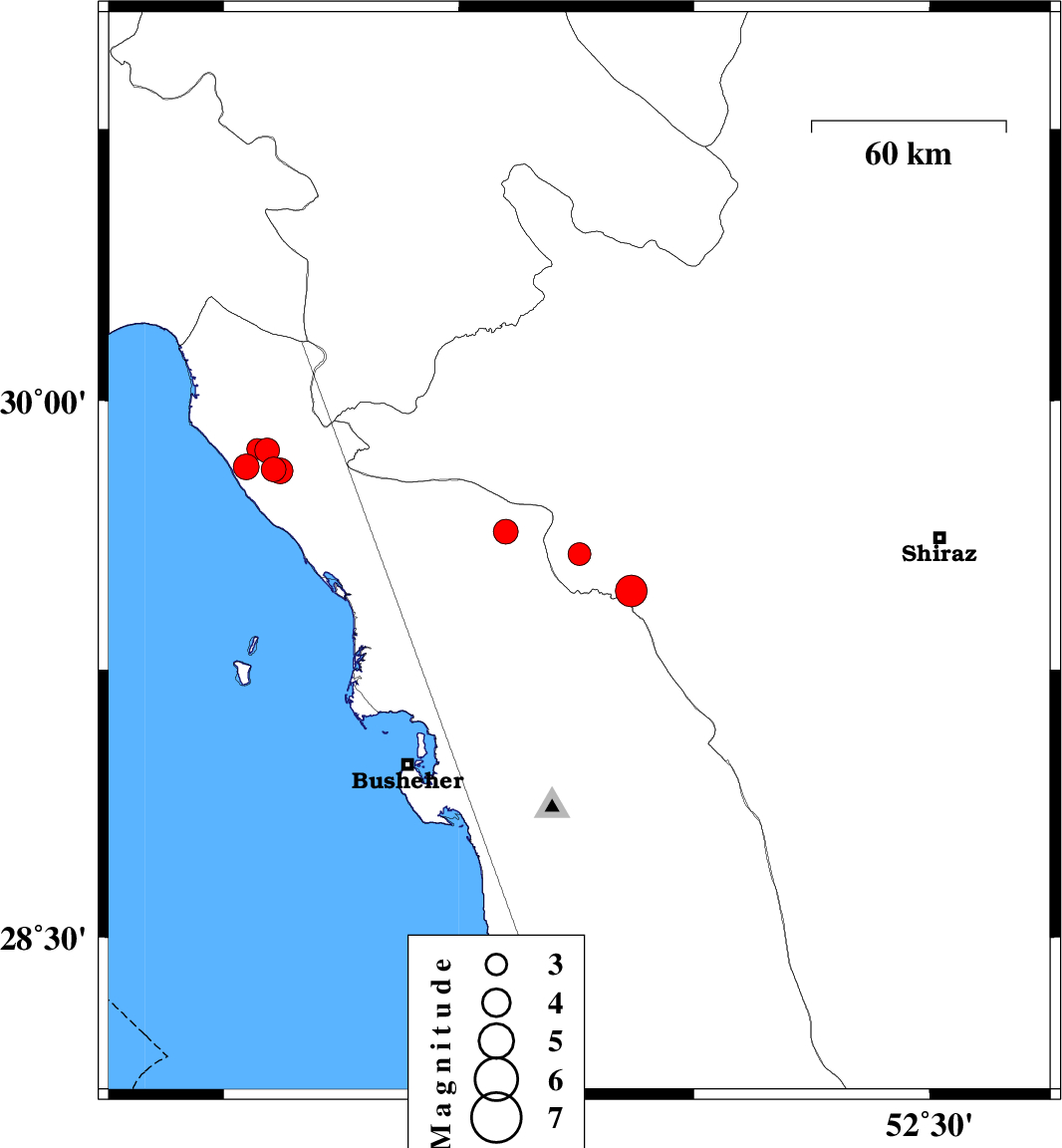 | 2025/03/09 | 14:13:42.5 | 17:43:42.5 | 29.866 | 50.357 | 12 | ML:3 | Khoozestan Province, 36 km North-West of Bandar-e genaveh |