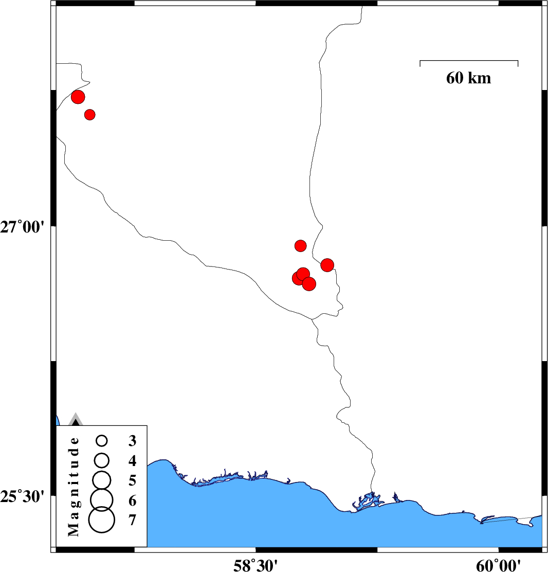 | 2025/05/15 | 07:23:04.1 | 10:53:04.1 | 26.711 | 58.766 | 16 | ML:3.8 | Kerman Province, 153 km North-West of Nikshahr | ||