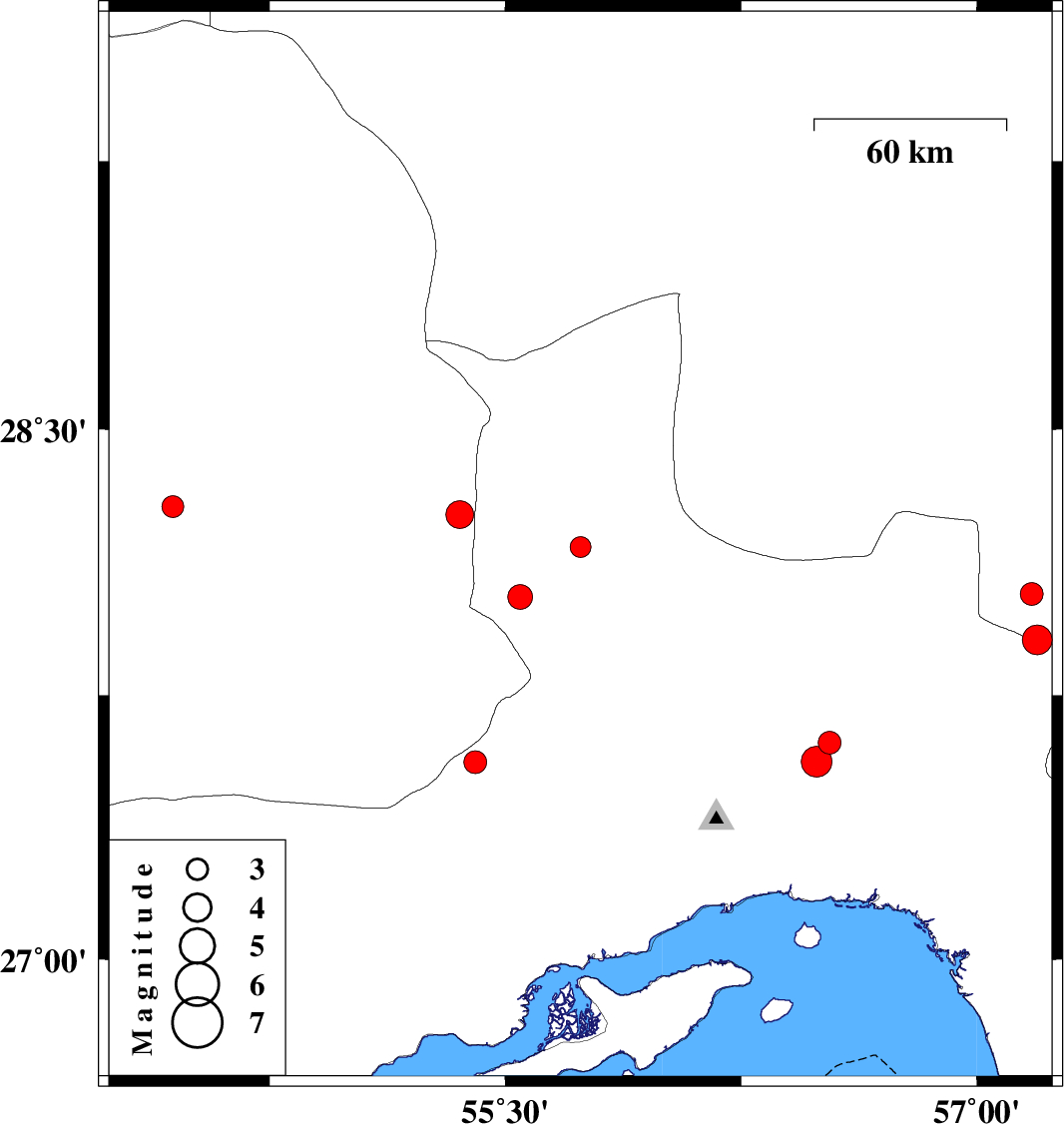 | 2024/12/29 | 12:07:44.6 | 15:37:44.6 | 27.56 | 55.404 | 12 | ML:3.2 | Hormozgan Province, 106 km South-East of Lar | ||