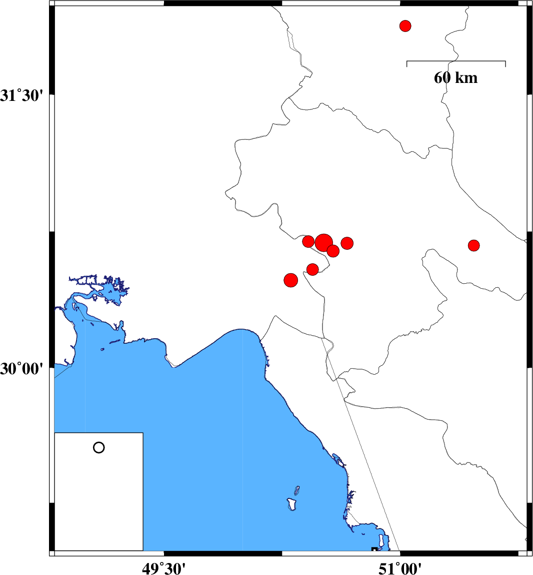 | 2025/05/27 | 14:31:54.5 | 18:01:54.5 | 30.541 | 50.444 | 12 | ML:3.4 | Khoozestan Province, 20 km -East of Behbahan | ||