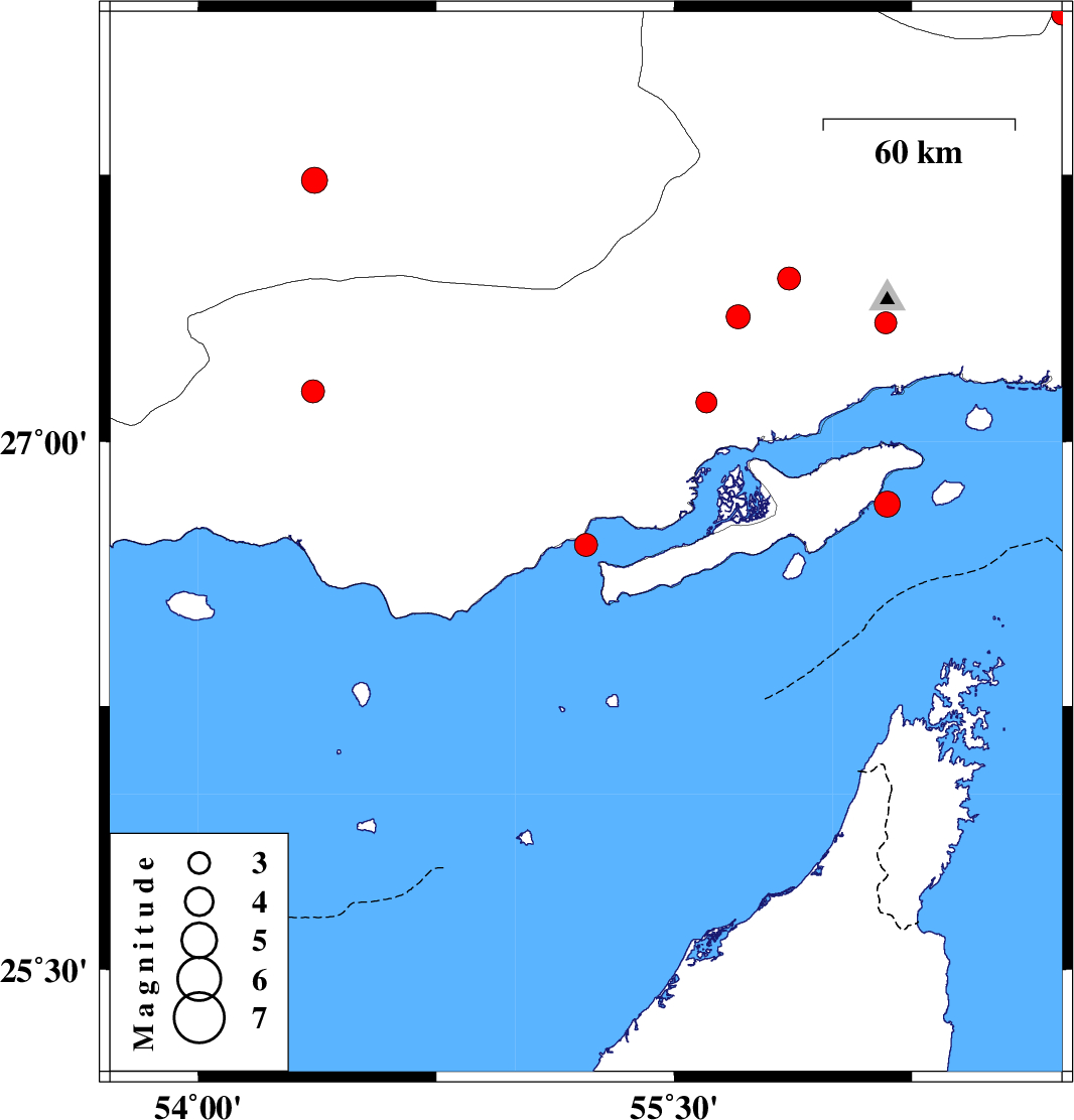 | 2025/05/23 | 14:30:17.1 | 18:00:17.1 | 26.823 | 56.171 | 12 | ML:3.6 | Persian Gulf, 18 km South of Qeshm | ||