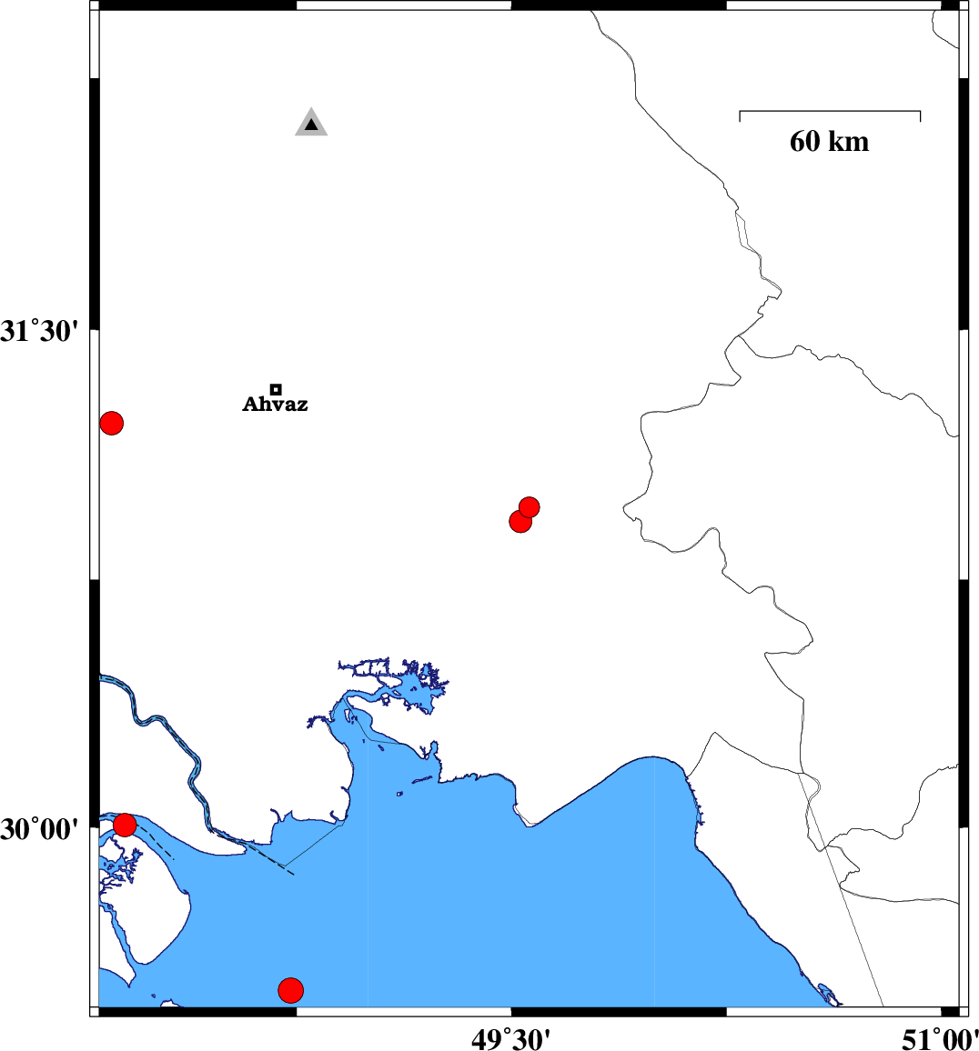 | 2025/06/10 | 06:04:40.1 | 09:34:40.1 | 30.952 | 49.561 | 12 | ML:3.6 | Khoozestan Province, 25 km North-West of Omidiyeh | ||