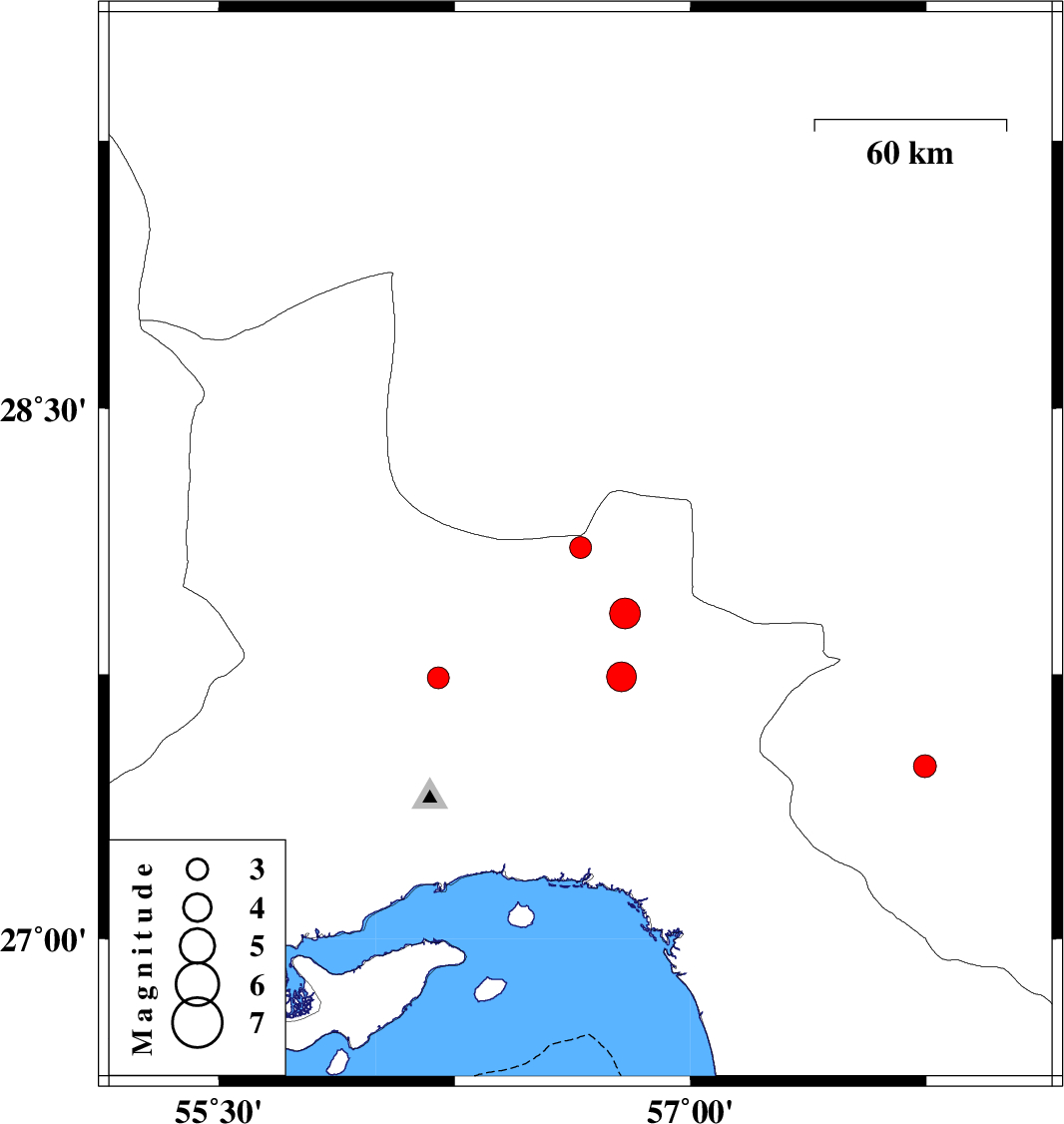 | 2025/06/19 | 08:13:07.7 | 11:43:07.7 | 27.744 | 56.78 | 12 | ML:4.2 | Hormozgan Province, 57 km North-West of Dehbarez | ||