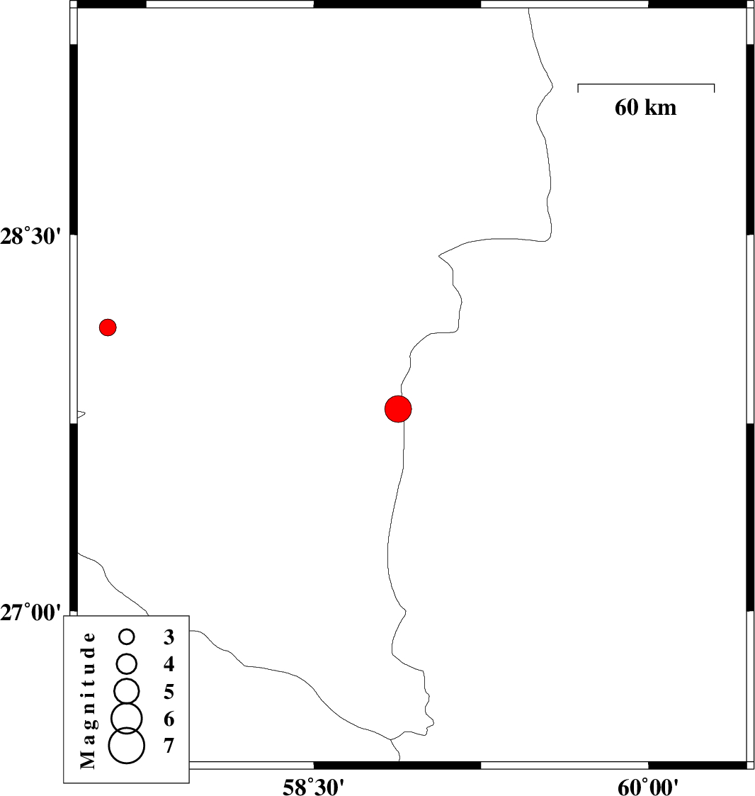 | 2025/08/01 | 20:25:38.8 | 23:55:38.8 | 28.217 | 57.637 | 12 | ML:3.4 | Kerman Province, 30 km North of Kahnuj |