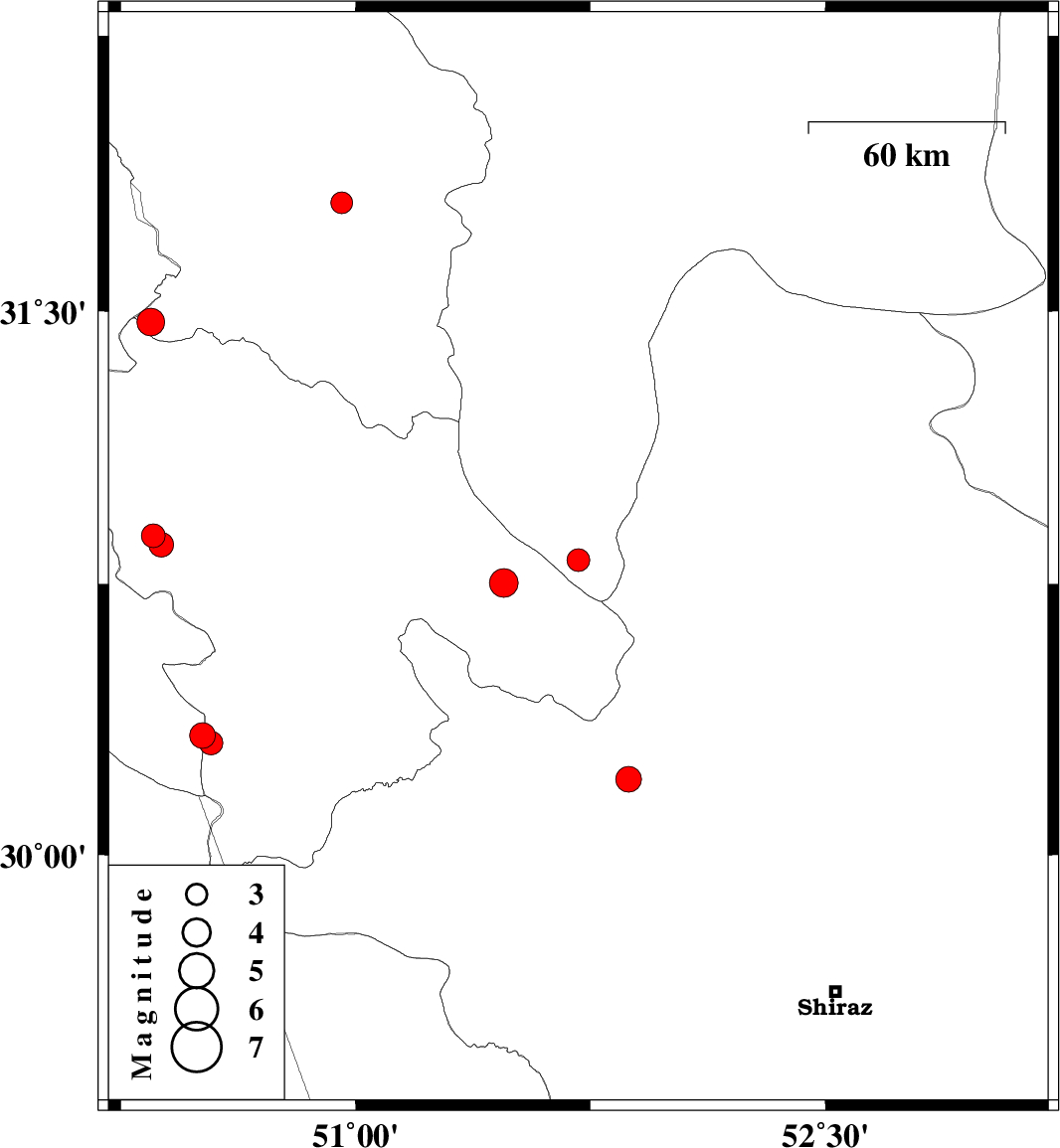 | 2025/08/02 | 02:34:09.7 | 06:04:09.7 | 30.21 | 51.872 | 12 | ML:3.7 | Fars Province, 12 km -West of Ardakan | ||