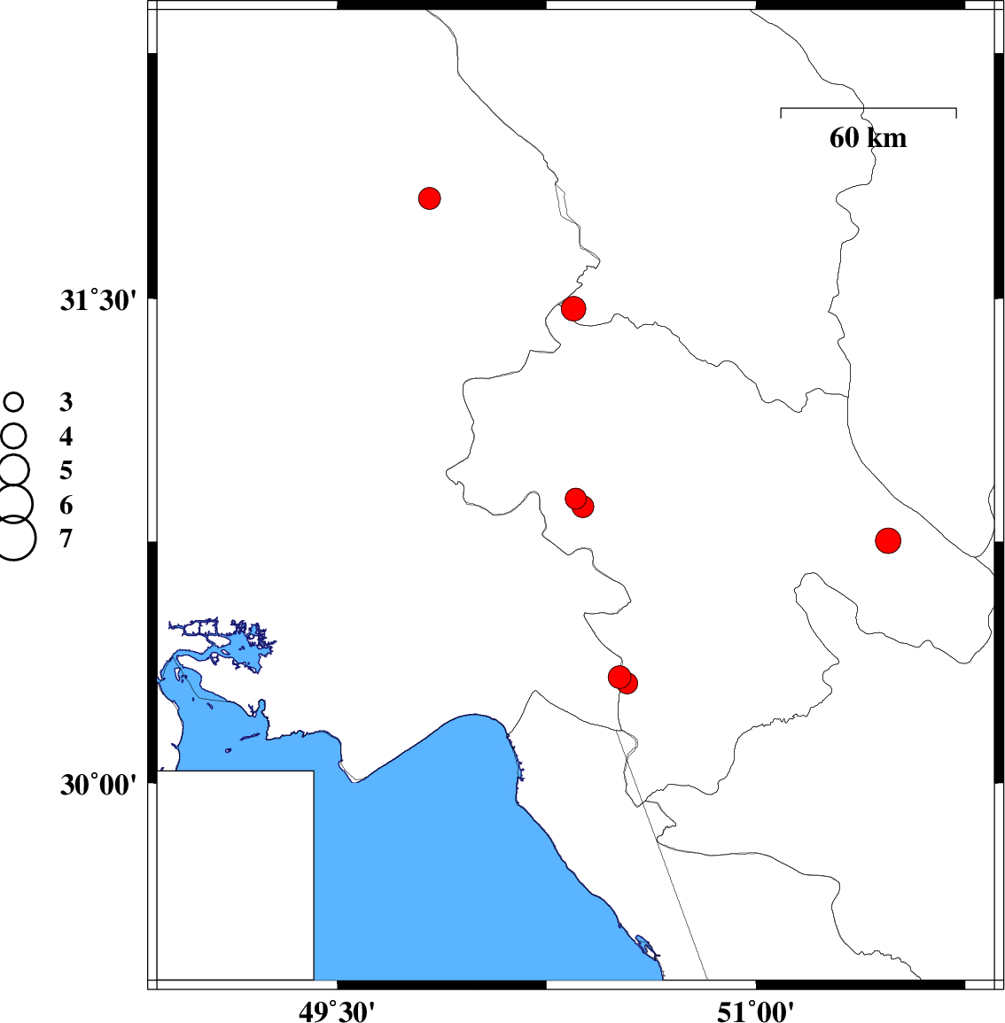 | 2025/07/29 | 16:58:04.2 | 20:28:04.2 | 31.806 | 49.83 | 12 | ML:3.5 | Khoozestan Province, 5 km of Izeh | ||