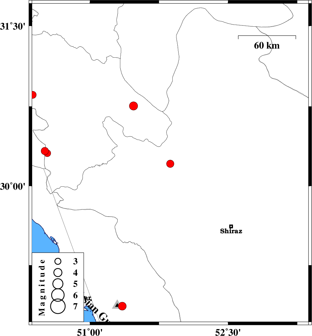 | 2025/07/29 | 22:12:38.6 | 01:42:38.6 | 30.753 | 51.473 | 12 | ML:4.1 | Kohkiluieh va boyerahmad Province, 13 km South of Sisakht | ||