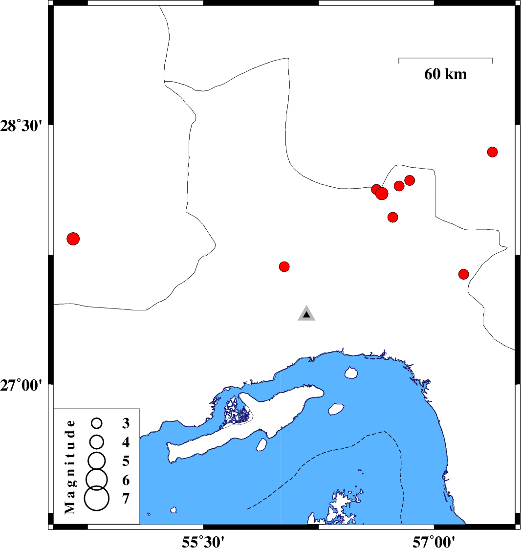 | 2025/07/27 | 22:22:29.3 | 01:52:29.3 | 28.127 | 56.624 | 12 | ML:3 | Hormozgan Province, 74 km South-East of Hajiabad |