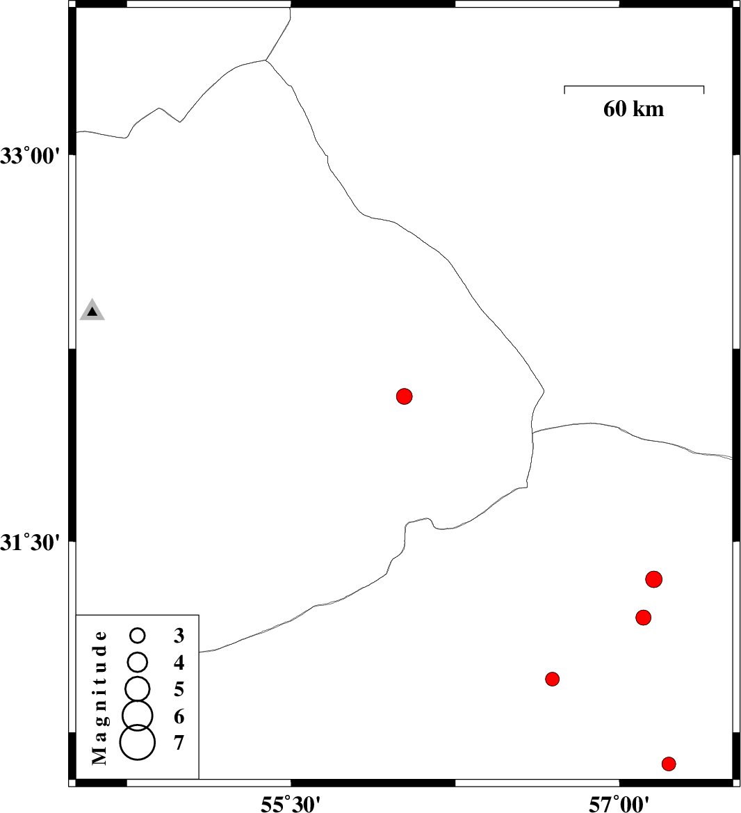 | 2025/08/31 | 22:04:45.3 | 01:34:45.3 | 30.626 | 57.225 | 12 | ML:2.8 | Kerman Province, 40 km North-East of Kerman | ||
