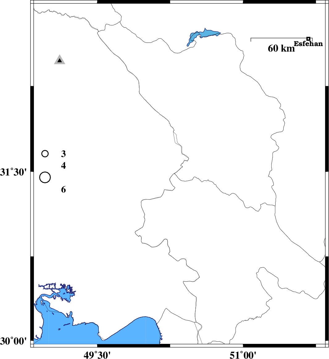 | 2025/07/24 | 15:57:45.7 | 19:27:45.7 | 31.795 | 50.955 | 12 | ML:3.1 | Chaharmahal Bakhtiari Province, 36 km North-East of Lordegan | ||