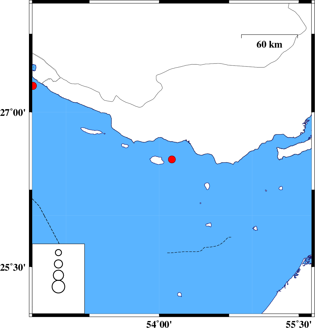 | 2025/09/03 | 08:45:33.3 | 12:15:33.3 | 27.252 | 52.643 | 12 | ML:3.6 | Persian Gulf, 41 km South-West of Mehr |