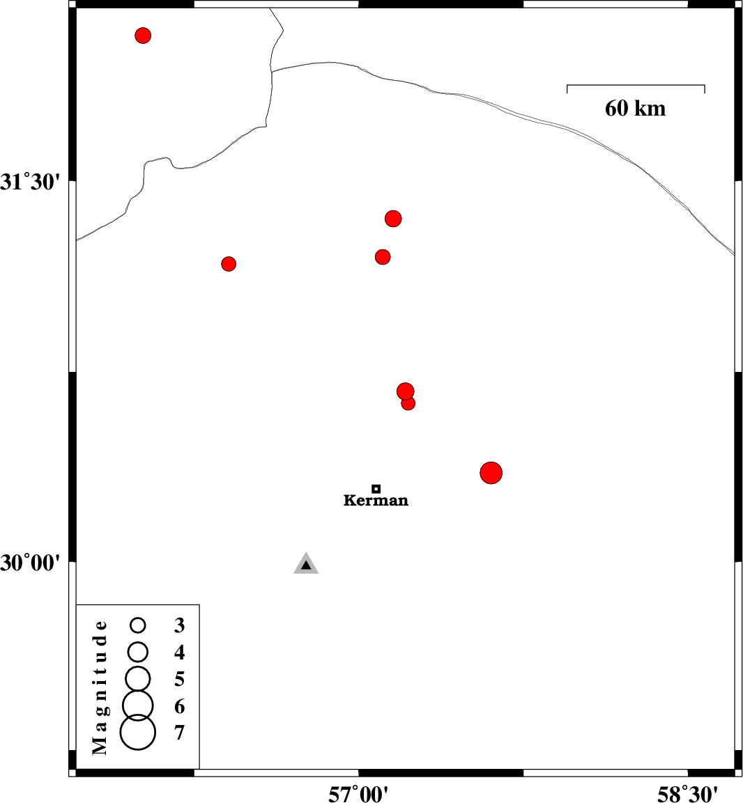 | 2025/09/15 | 09:07:24.1 | 12:37:24.1 | 30.673 | 57.212 | 12 | ML:3.5 | Kerman Province, 45 km North-East of Kerman | ||