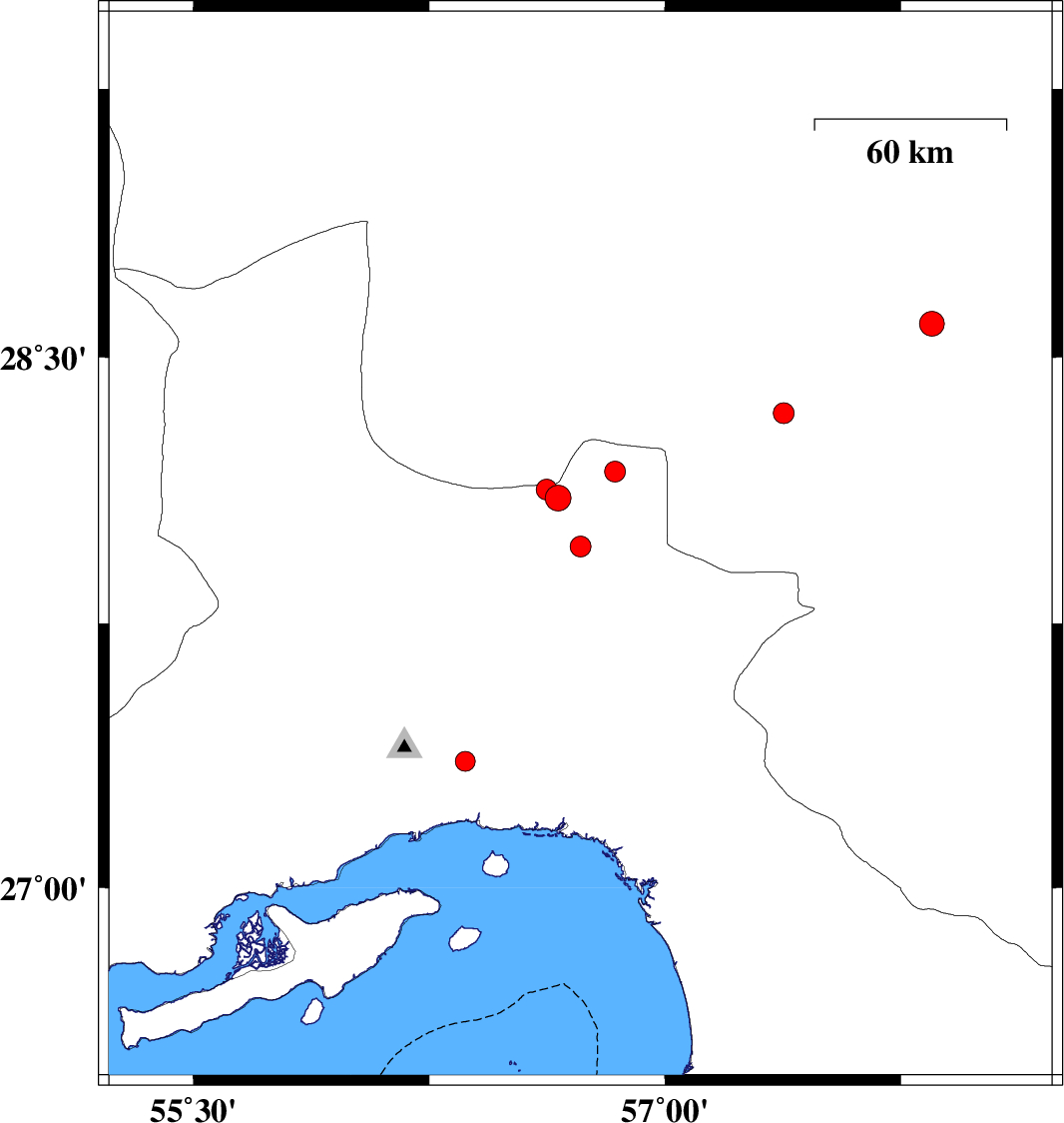 | 2025/07/28 | 10:20:55.8 | 13:50:55.8 | 28.179 | 56.84 | 12 | ML:3 | Hormozgan Province, 93 km South-East of Hajiabad | ||