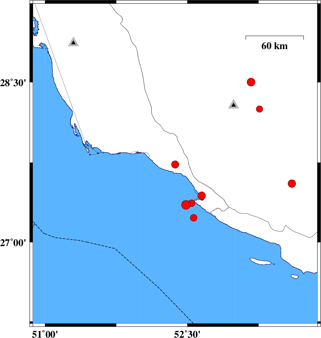 | 2025/09/15 | 21:03:21.7 | 00:33:21.7 | 27.352 | 52.486 | 12 | ML:4.2 | Persian Gulf, 45 km South-West of Mehr | ||
