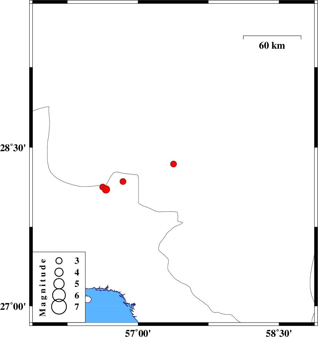 | 2025/07/27 | 22:22:29.3 | 01:52:29.3 | 28.127 | 56.624 | 12 | ML:3 | Hormozgan Province, 74 km South-East of Hajiabad |