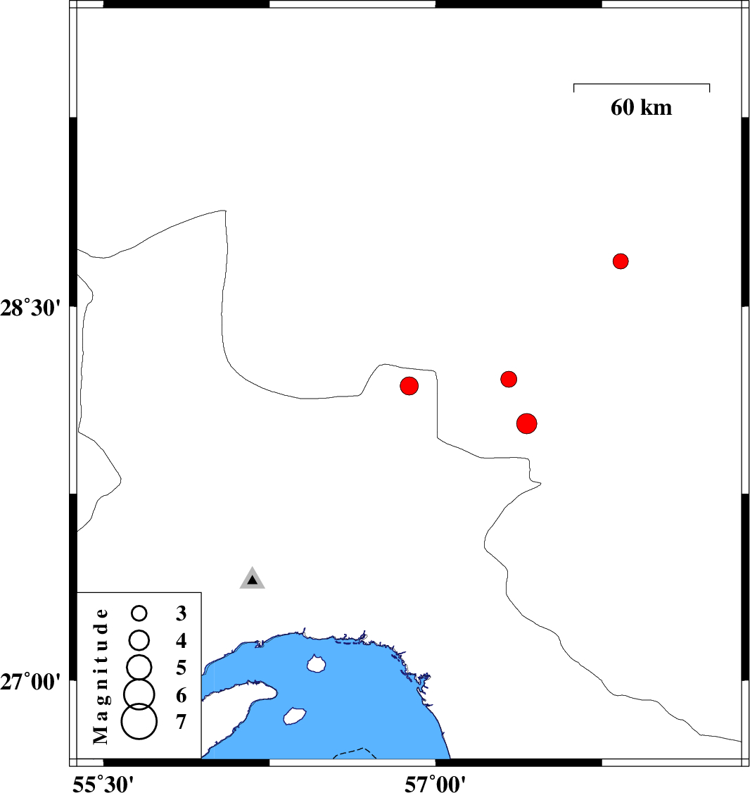 | 2025/09/12 | 06:51:42.1 | 10:21:42.1 | 28.209 | 57.33 | 12 | ML:3.2 | Kerman Province, 46 km North-West of Kahnuj | ||