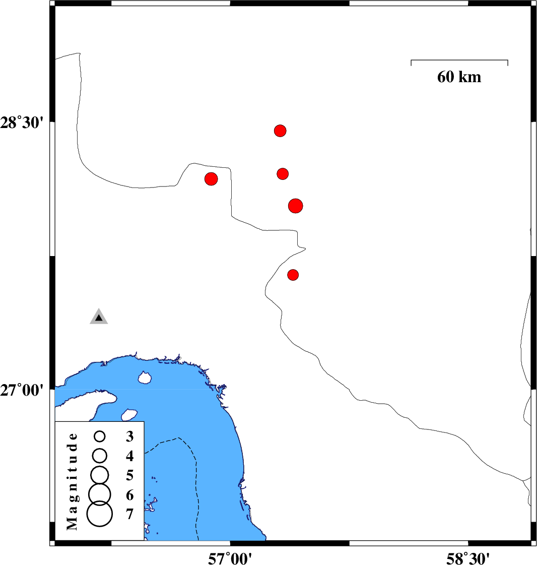| 2025/09/12 | 06:51:42.1 | 10:21:42.1 | 28.209 | 57.33 | 12 | ML:3.2 | Kerman Province, 46 km North-West of Kahnuj | ||