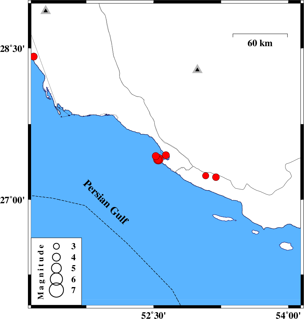 | 2025/07/26 | 10:55:28.1 | 14:25:28.1 | 27.398 | 52.551 | 12 | ML:3.7 | Persian Gulf, 37 km South-West of Mehr | ||